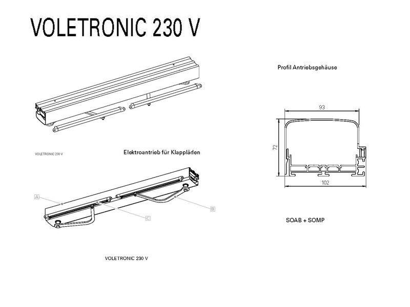 Antriebsgehäuse A mit Befestigungsbohrungen, Antriebsmodulen, Flügelarmen B , Führungsschienen C , Anschlusskabel,